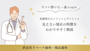 渋谷宮下パーク歯科・矯正歯科では、裏側矯正だけでなく、マウスピース矯正・表側矯正・部分矯正など、多様な選択肢から患者さんに合った治療方法をご提案しています。横顔や見た目を自然に整えたい方、装置が目立つのが気になる方は、ぜひ一度ご相談ください。