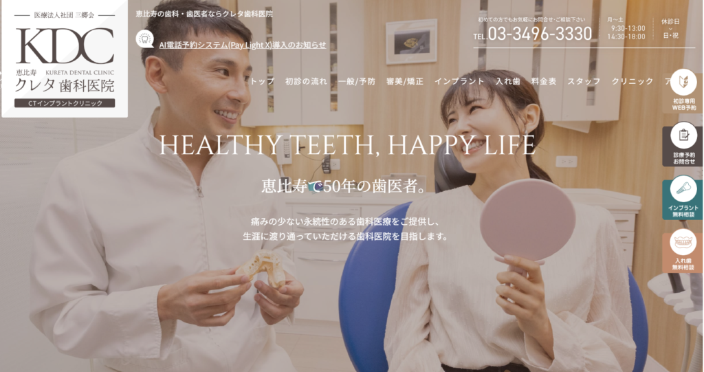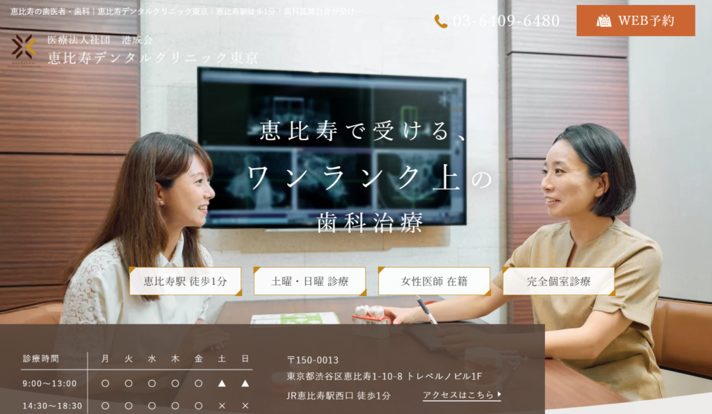 恵比寿ミカ歯科クリニックは、女性歯科医師が多く在籍し、細やかな気配りと痛みの少ない丁寧な施術で人気を集めるクリニックです。