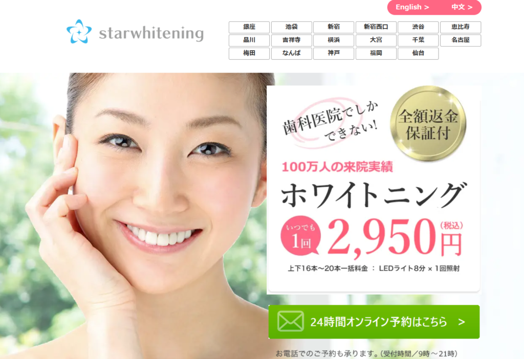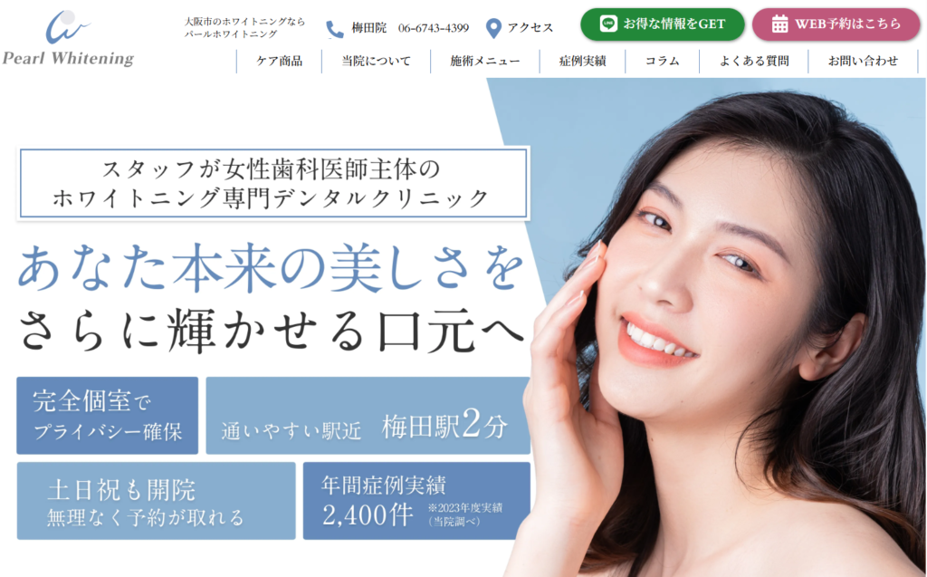 全国展開しており、大阪府内にも多数の提携医院を持つホワイトニングの最大手フランチャイズです。豊富な症例実績に基づいた高品質な施術と、まるでエステサロンのようなリラックスできる空間作りが魅力となっています。