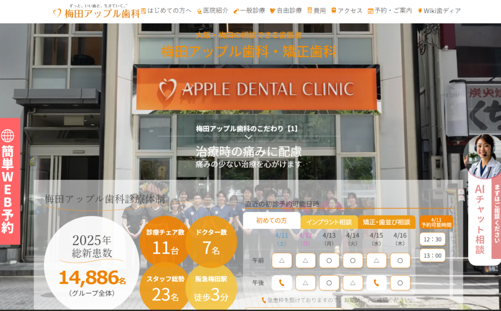 梅田アップル歯科は、虫歯治療や予防歯科などの一般診療も幅広く手がける総合歯科医院です。単に歯を白くするだけでなく、お口全体の健康を考えたトータルケアの一環としてホワイトニングを提供しています。