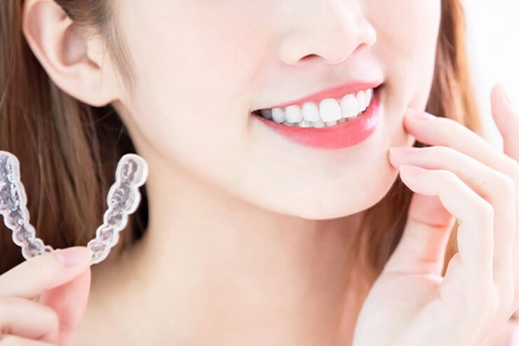 当院では透明で薄い素材でできた「インビザライン」という矯正装置を採用しており、装着中の見た目を気にせず矯正治療を進められます。食事や歯みがきの際には取り外すこともでき、衛生的にお使いいただけます。
