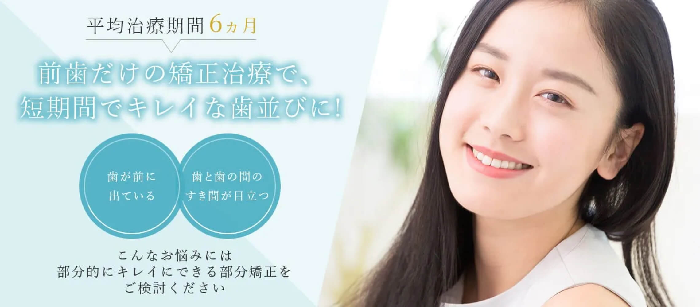 前歯など一部の歯並びだけを整える矯正方法です。全体の矯正に比べて、治療期間が短く、費用も抑えられるのが特長です。気になる前歯のデコボコやすき間を整えたい方、結婚式や就職活動などに向けて短期間で見た目を改善したい方におすすめです。